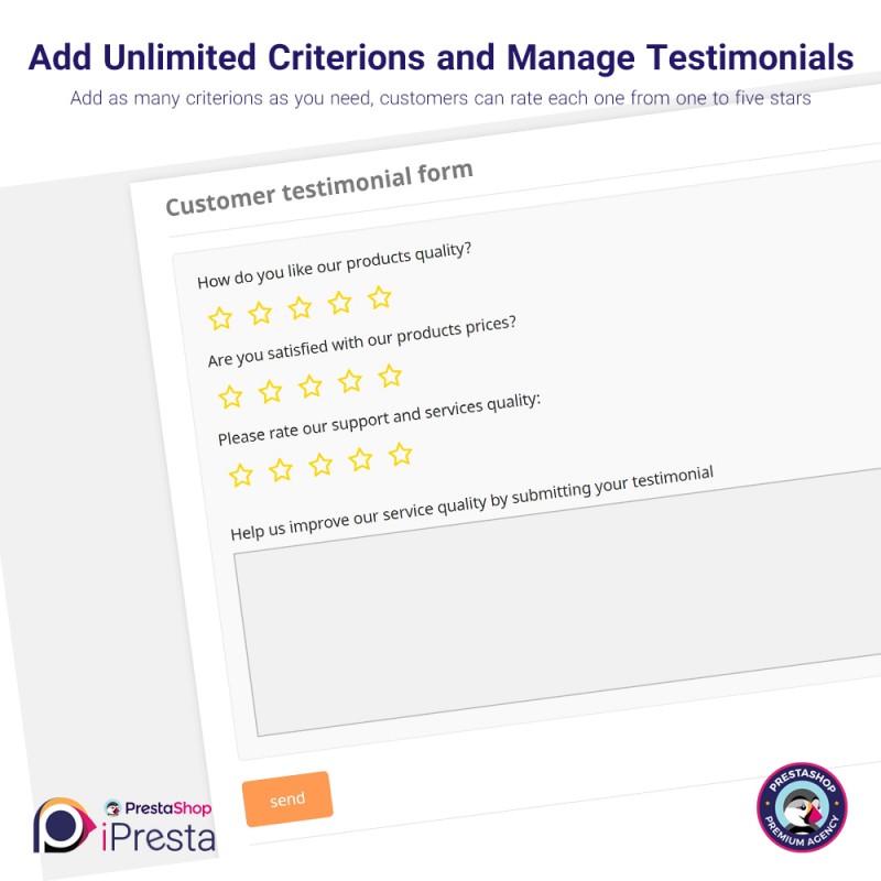 It is a very hard and time consuming process to ask each customer to write their testimonial by email or record it by phone, and then show it on your shop. The iPresta Testimonials Module for PrestaShop will handle everything for you automatically.